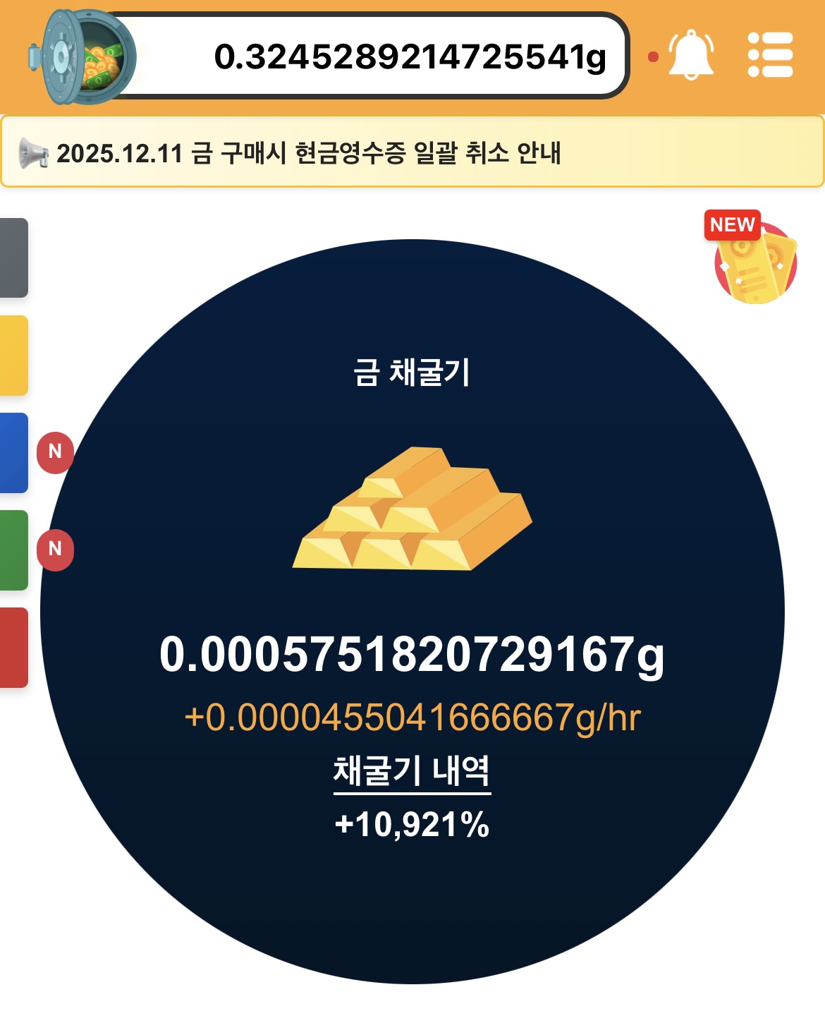 금캐기는 1그램부터 실물 골드바 교환이 가능하므로 이 시간의 투자가 가장 중요합니다.