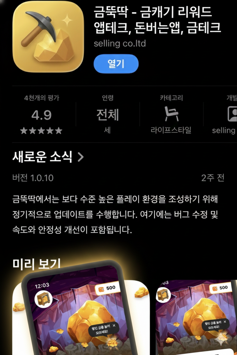 정리하자면 금뚝딱은 금캐기처럼 골드바 교환을 목표로 하는 앱이지만, 교환 기준이 더 낮고 구조가 비교적 단순한 편이다.