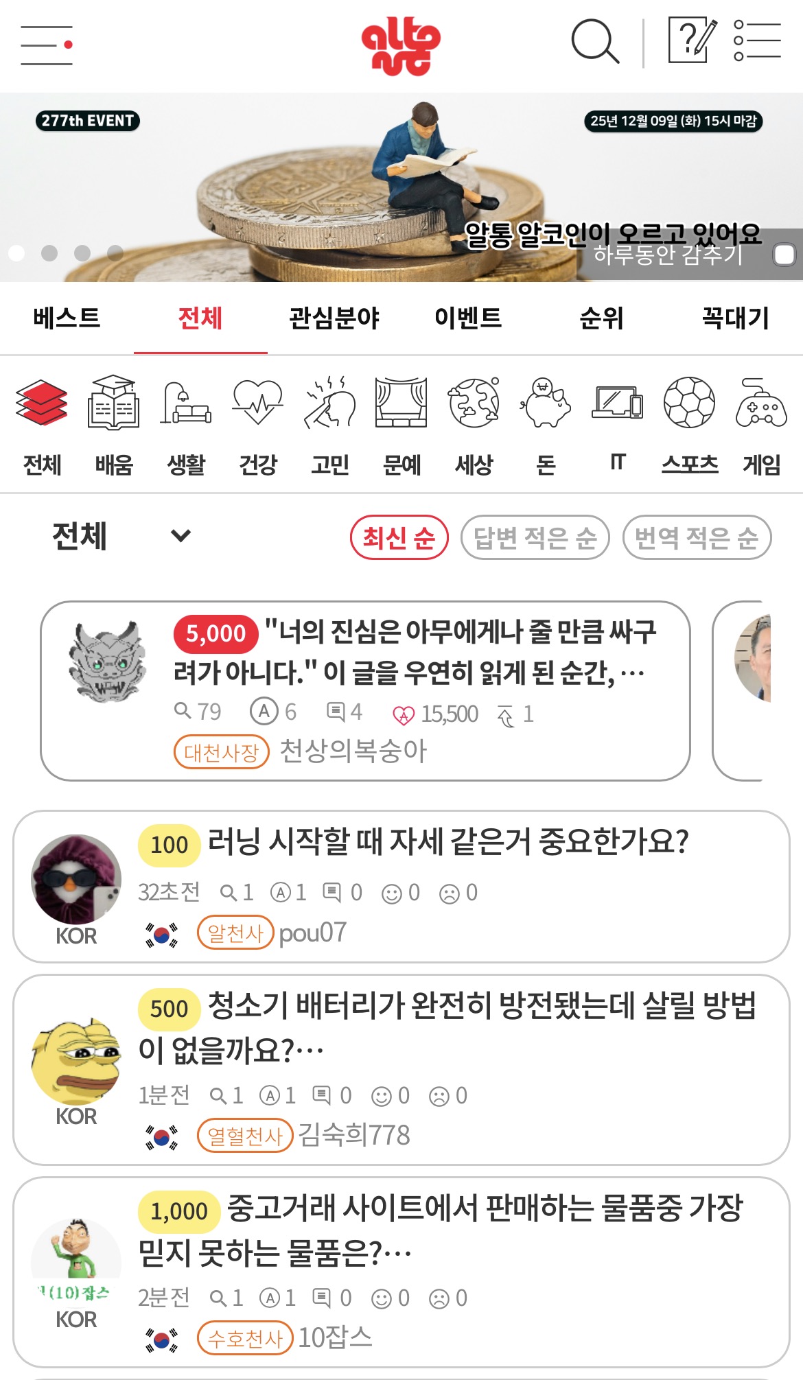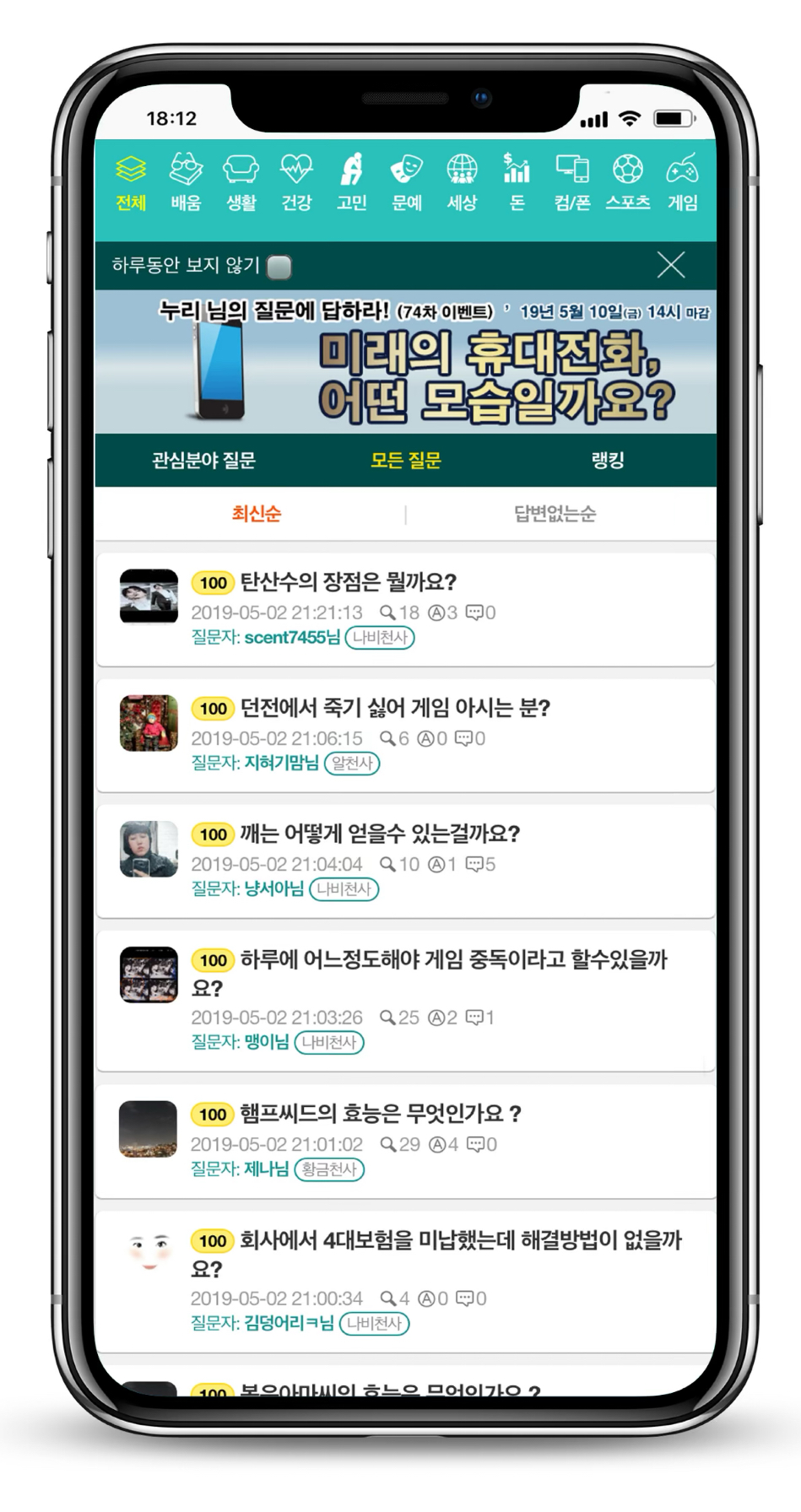 앱 내에는 '최신순', '랭킹' 등의 질문 카테고리가 있습니다. 랭킹 에 있는 질문은 많은 사용자들이 관심을 가진 질문이므로, 여기에 상세하고 전문적인 답변을 달면 채택될 확률이 높아져 더 큰 수익을 기대할 수 있습니다.