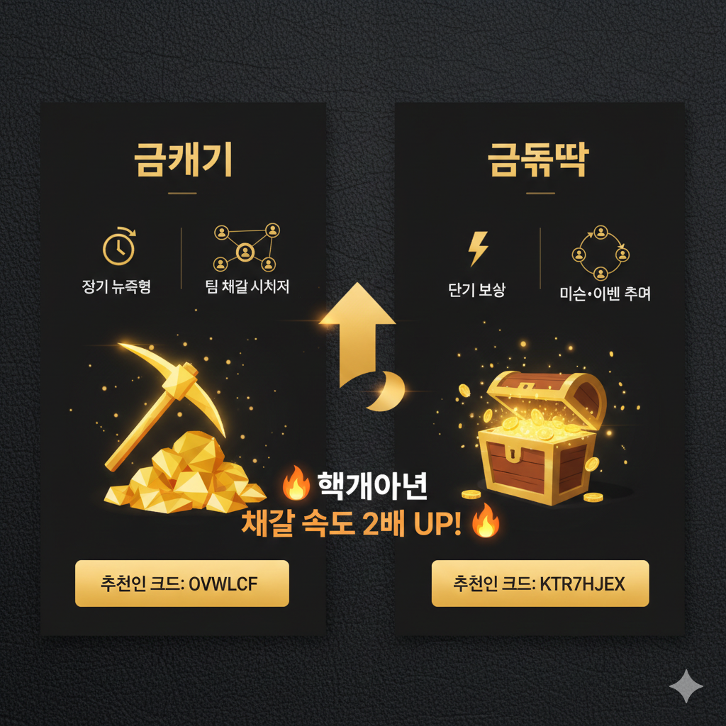 금캐기가 묵묵히 땅을 파는 광부의 마음이라면, 금뚝딱은 다양한 이벤트와 미션을 수행하며 보물 상자를 여는 모험가에 가깝습니다.